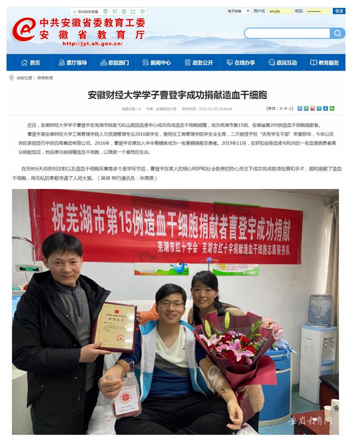 1月2日,安徽教育网、中安教育网、安徽网报道了我校学子曹登宇成功捐献造血干细胞,具体报道链接如下: