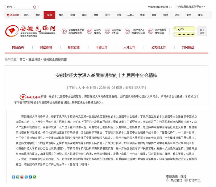 1月6日,安徽先锋网、安徽教育网报道了我校深入基层宣讲党的十九届四中全会精神,具体链接如下: