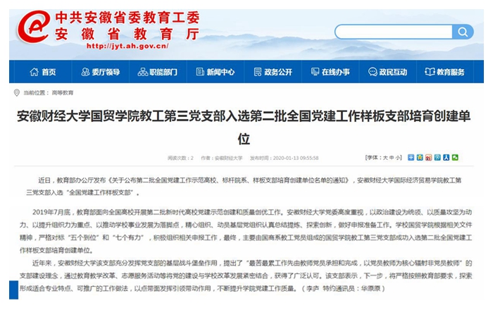 1月13日,安徽教育网、安徽先锋网报道了我校国贸学院教工第三党支部入选第二批全国党建工作样板支部培育创建单位,具体链接报道如下: