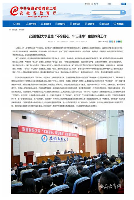 1月16日,安徽教育网、安徽先锋网报道了我校召开“不忘初心、牢记使命”主题教育总结大会。