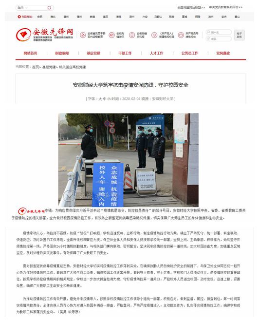 2月4日,安徽先锋网报道了我校筑牢抗击疫情安保防线,守护校园安全,坚决打赢疫情防控阻击战,具体报道链接如下: