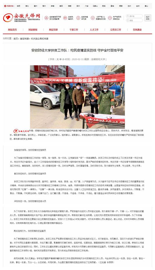 2月12日,安徽先锋网、安徽教育网、中安教育网报道了我校扶贫工作队深入扶贫帮扶点,构筑疫情坚实防线守护全村百姓平安,具体报道链接如下: