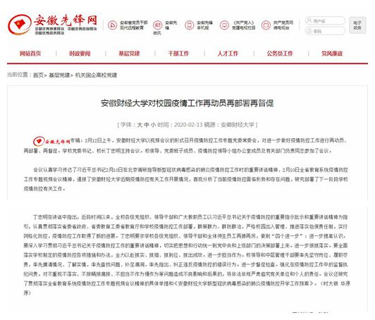 2月13日,安徽先锋网报道了我校召开党委常委会对疫情工作再动员再部署再督促,具体报道链接如下: