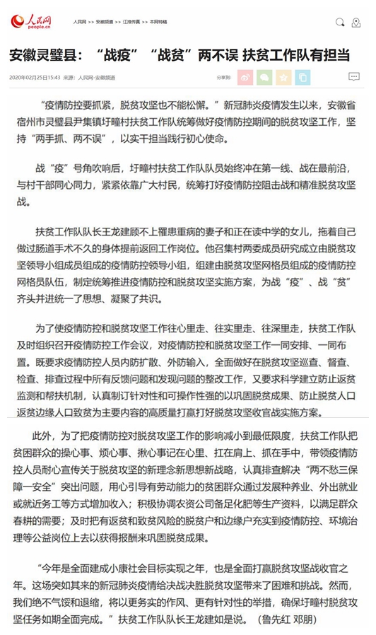 近日,人民网、安徽日报、今日头条先后以《安徽灵璧县:“战疫”“战贫”两不误 扶贫工作队有担当》《战“疫”、战“贫”两手抓、两不误——灵璧县尹集镇圩疃村扶贫工作队队长王龙建战“疫”期间战“贫”纪实》《疫情防控抓得紧 脱贫攻坚没放松》为题,报道我校扶贫干部王龙建先进事迹。相关报道链接如下: