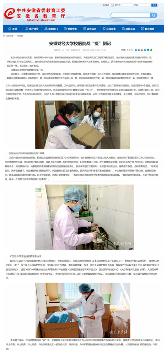 2月26日,安徽教育网报道了我校校医院战“疫”侧记。
