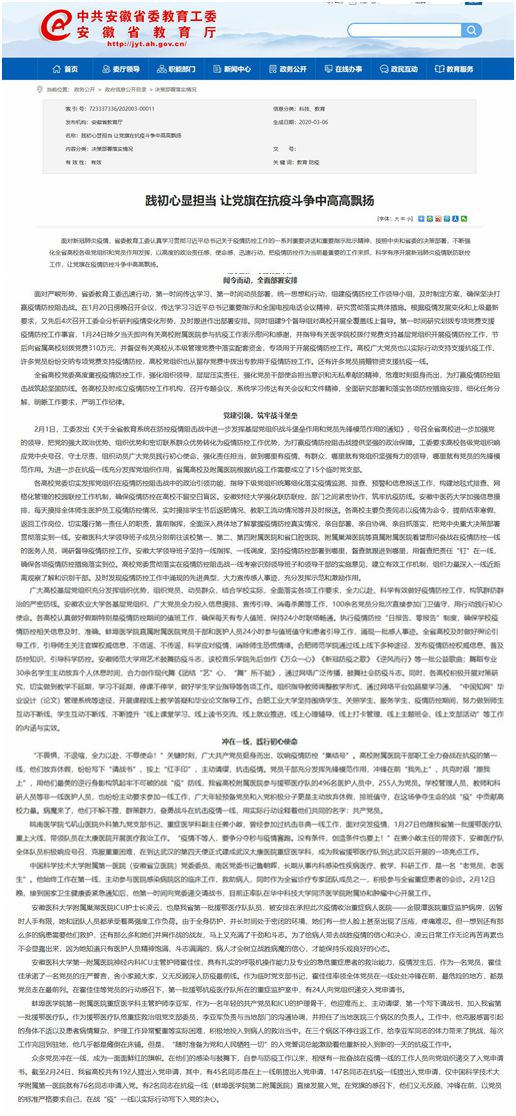3月6日,安徽教育网报道了疫情期间,安徽财经大学践初心显担当,让党旗高高飘扬在疫情斗争中。具体报道链接如下: