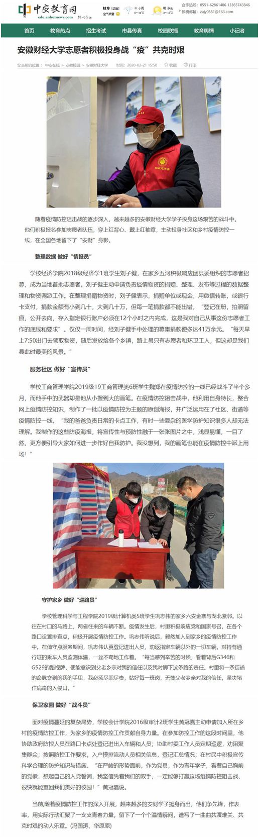 2月21日,中安教育网报道我校志愿者积极投身疫情防控工作,具体报道链接如下: