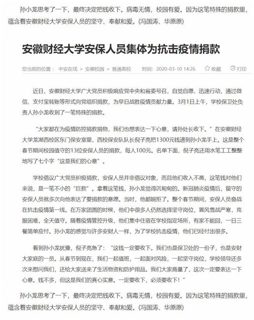 3月10日,中安教育网报道了我校安保人员集体为抗击疫情捐款,具体报道链接如下: