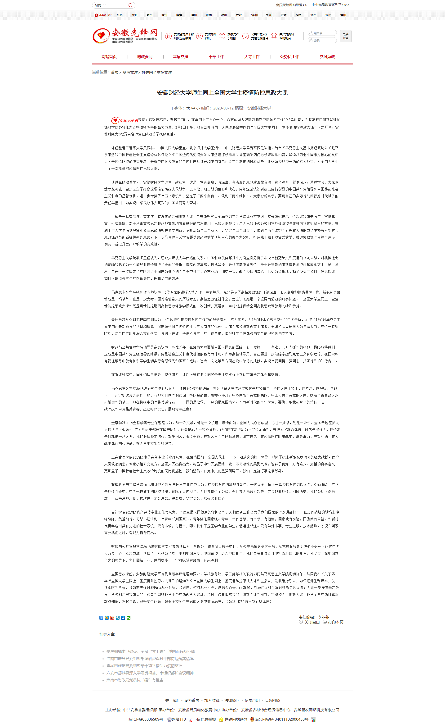 3月12日,安徽先锋网、中安教育网报道了我校师生同上全国大学生疫情防控思政大课,具体报道链接如下: