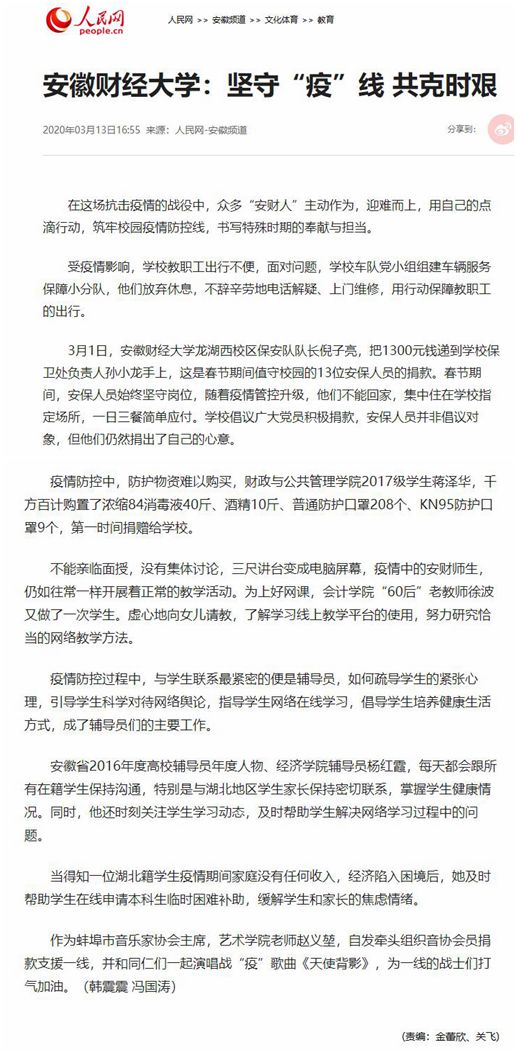 3月13日,人民网报道了我校师生坚守“疫”线,主动作为,迎难而上,共克时艰,具体报道链接如下: