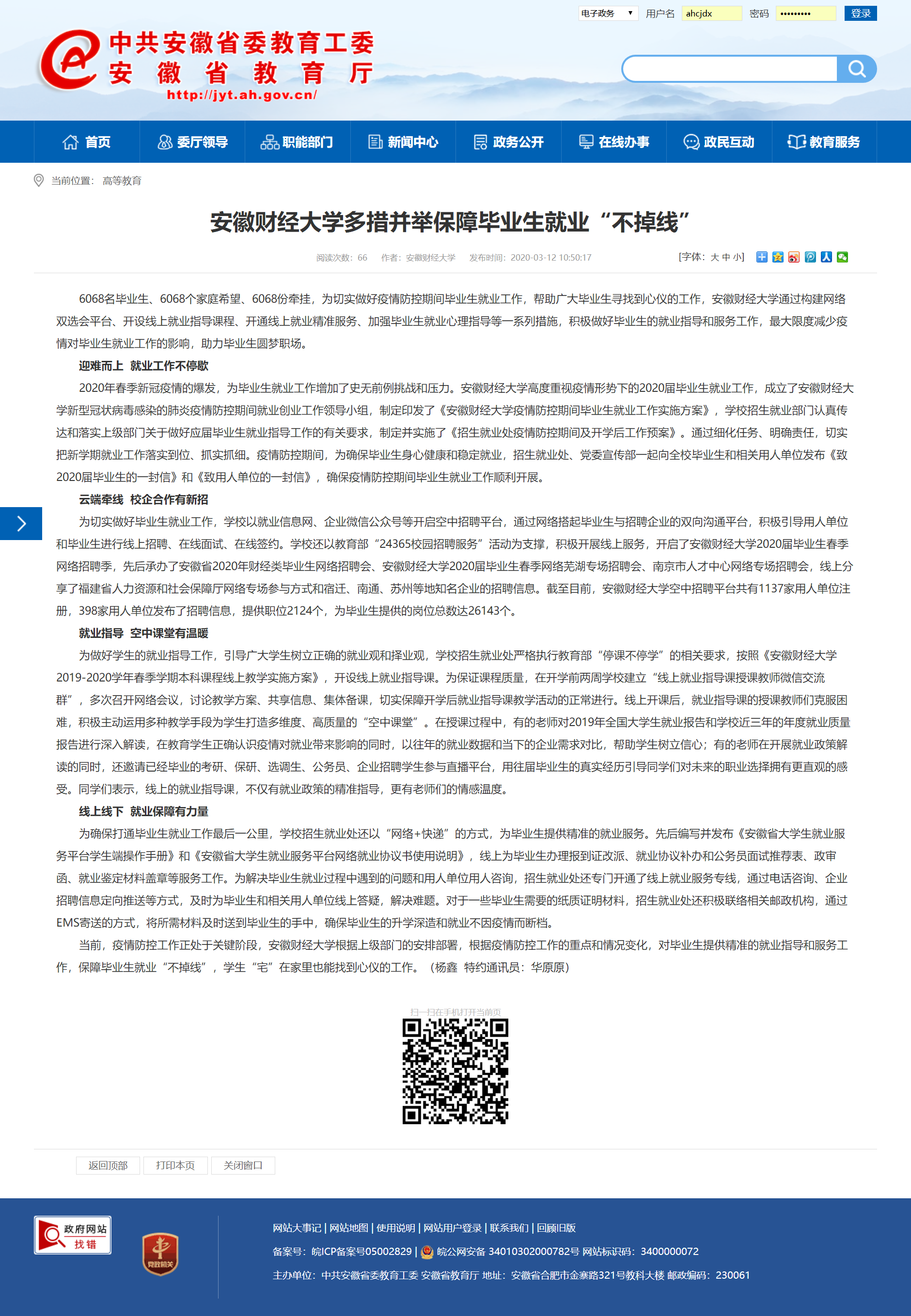 3月12日,安徽教育网报道了我校多措并举保障毕业生就业“不掉线”,具体报道链接如下: