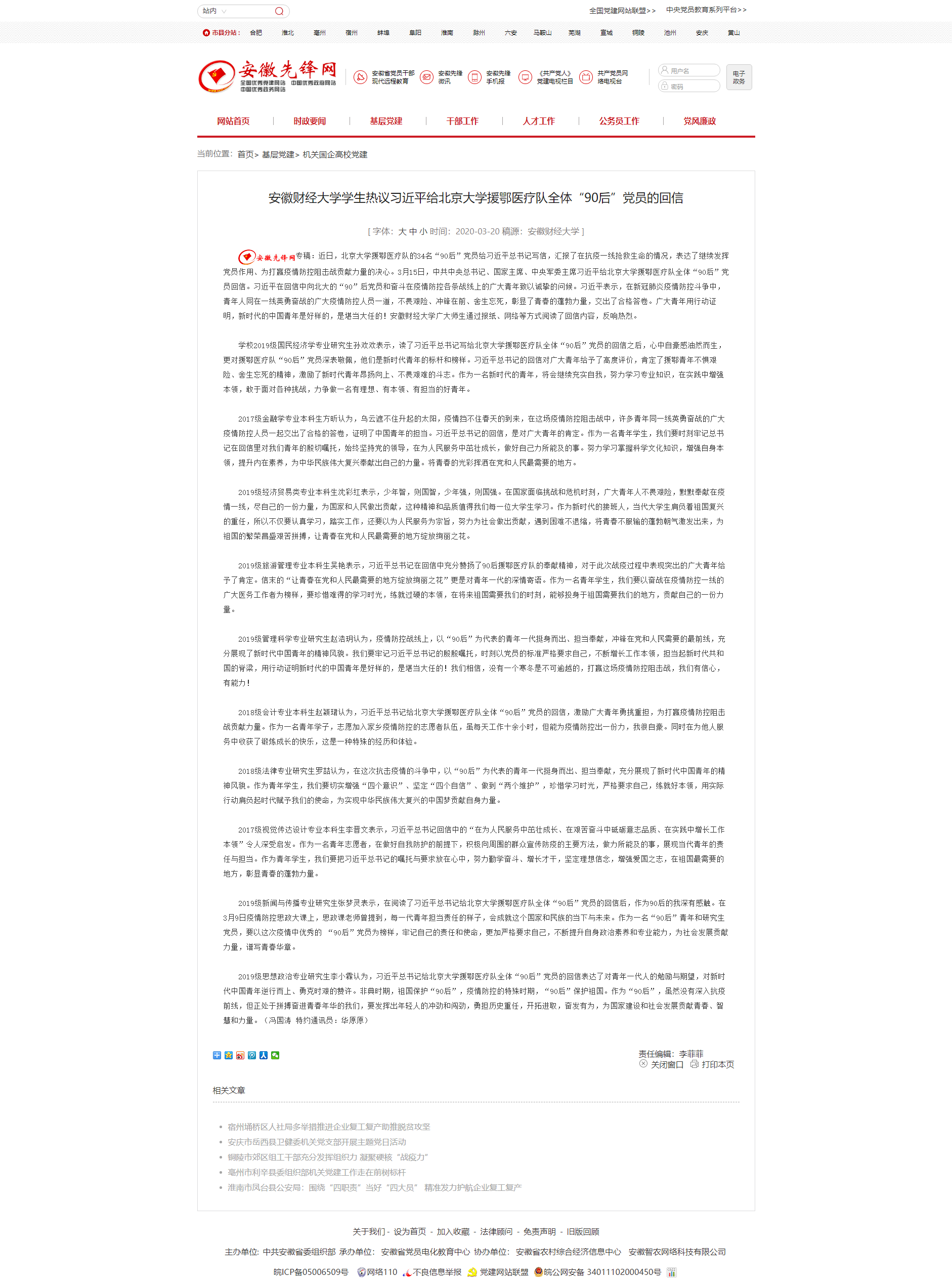 3月20日,安徽先锋网报道了我校学子热议习近平给北京大学援鄂医疗队全体“90后”党员的回信,具体报道链接如下: