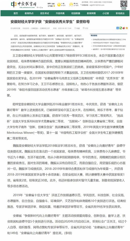 4月8日,中安教育网报道了我校学子获“安徽省优秀大学生”荣誉称号,具体报道链接如下: