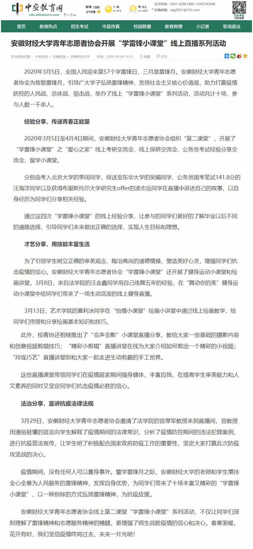 4月8日,中安教育网报道了我校青年志愿者协会开展“学雷锋小课堂”线上直播系列活动。具体报道链接如下:http://edu.anhuinews.com/system/2020/04/08/008395381.shtml