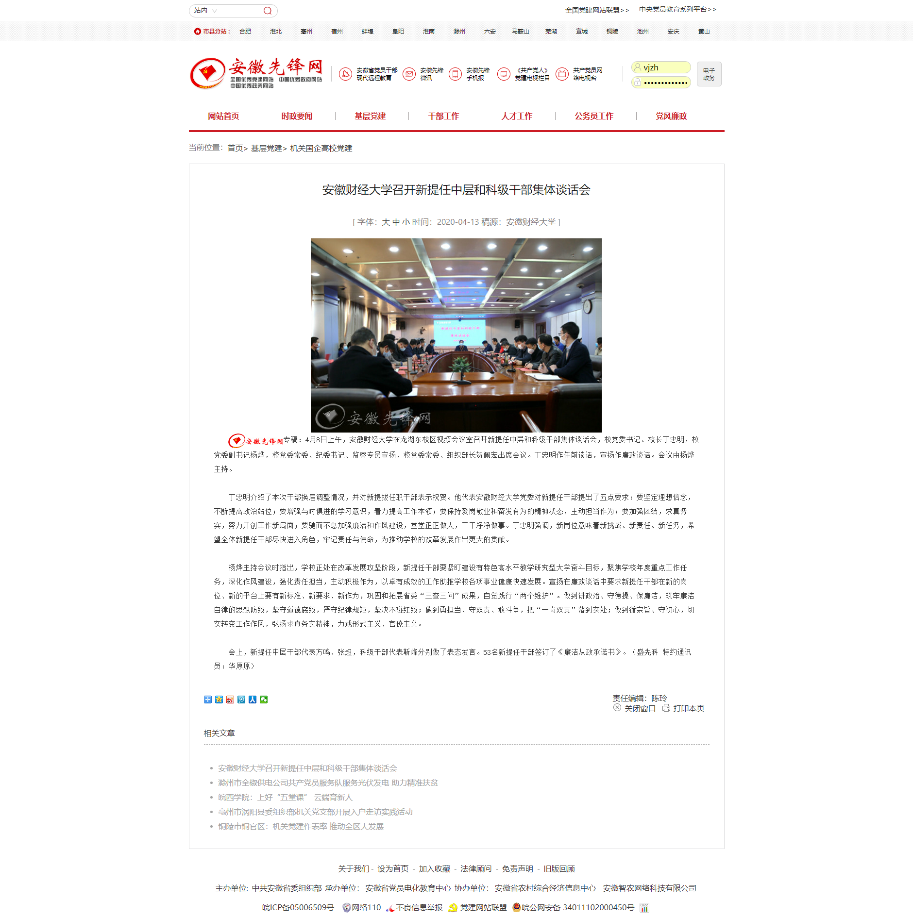 4月13日,安徽先锋网、中安教育网报道了我校召开新提任中层和科级干部集体谈话会,具体报道链接如下: