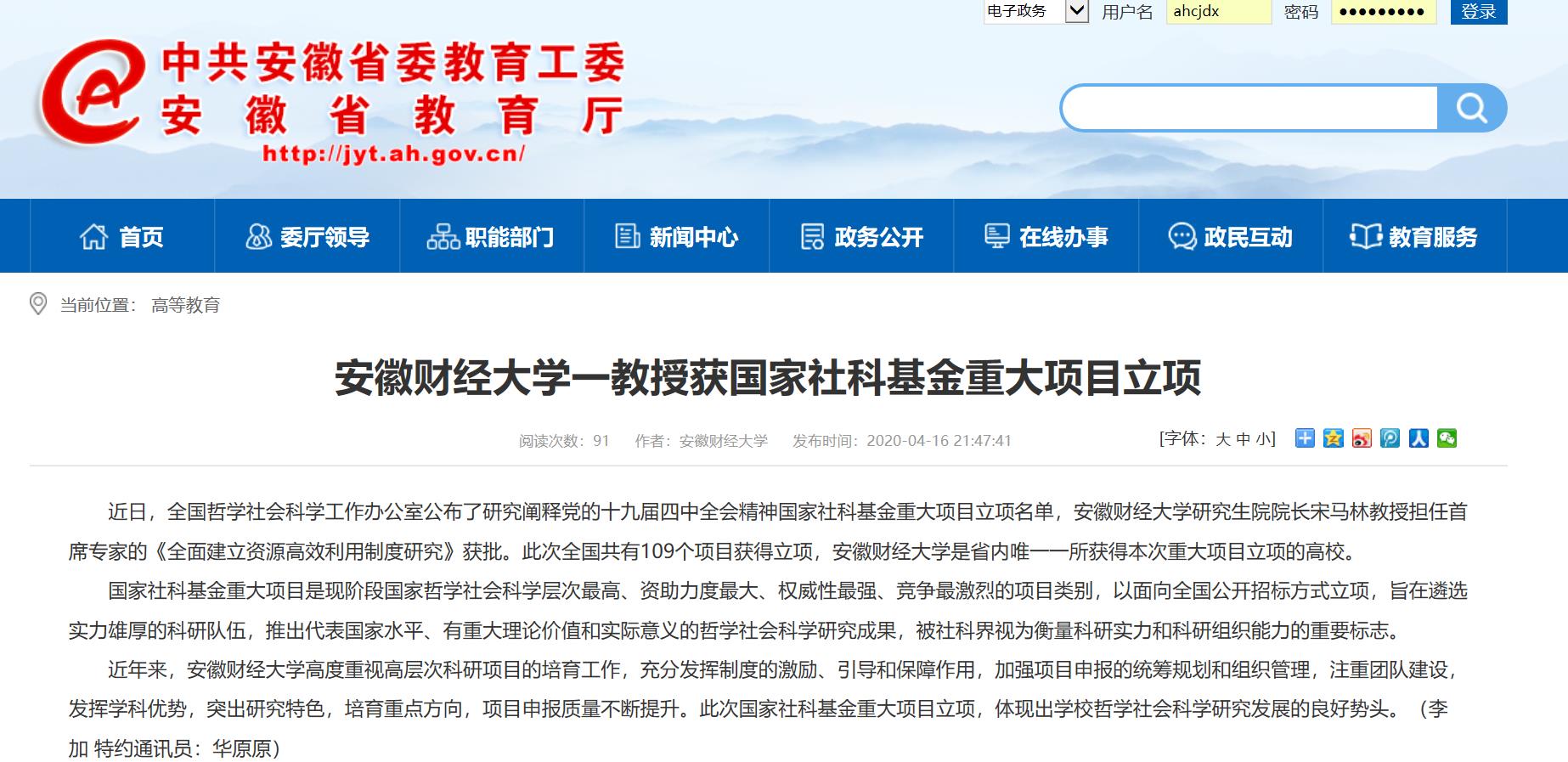 4月16日,安徽教育网报道了我校宋马林教授获国家社科基金重大项目立项,具体报道链接如下: