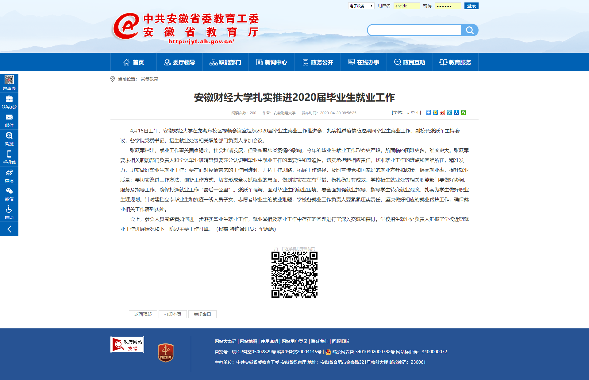 4月20日,安徽教育网报道了我校扎实推进2020届毕业生就业工作,具体报道链接如下: