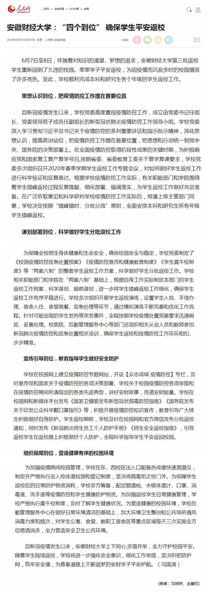 6月15日,人民网、安徽新闻网报道了我校“四个到位”,确保学生平安返校。具体报道链接如下: