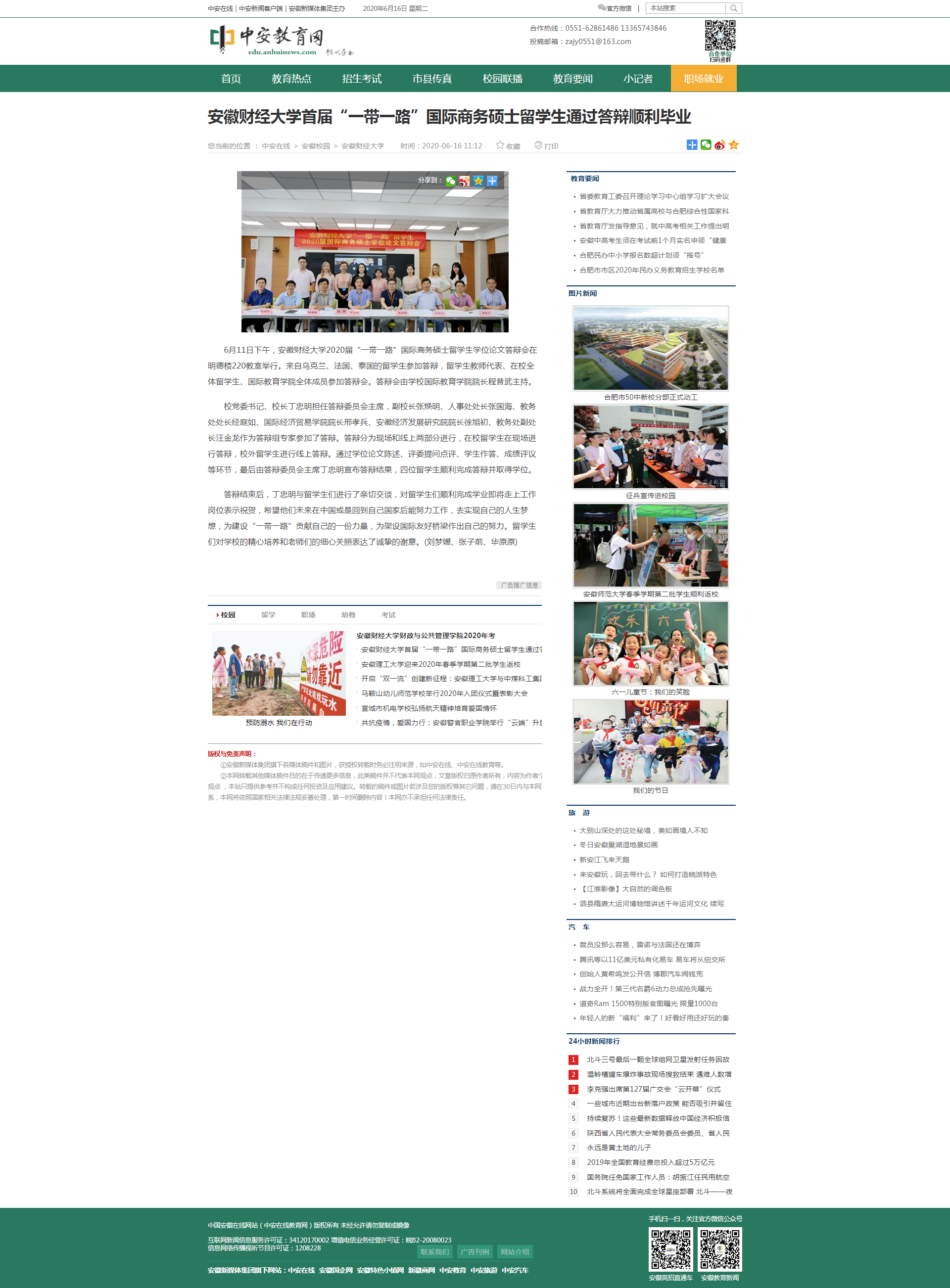 6月16日,中安教育网、安徽网报道我校首届“一带一路”国际商务硕士留学生通过答辩顺利毕业,具体报道链接如下: