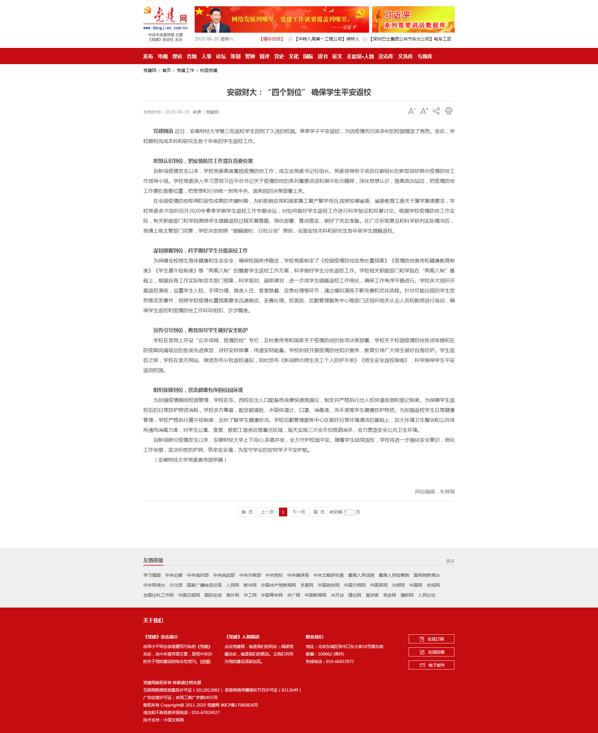 6月19日,党建网报道了我校“四个到位”,确保学生平安返校。具体报道链接如下:党建网报道链接:http://www.dangjian.cn/shouye/dangjiangongzuo/xiaoyuandangjian/202006/t20200619_5680333.shtml