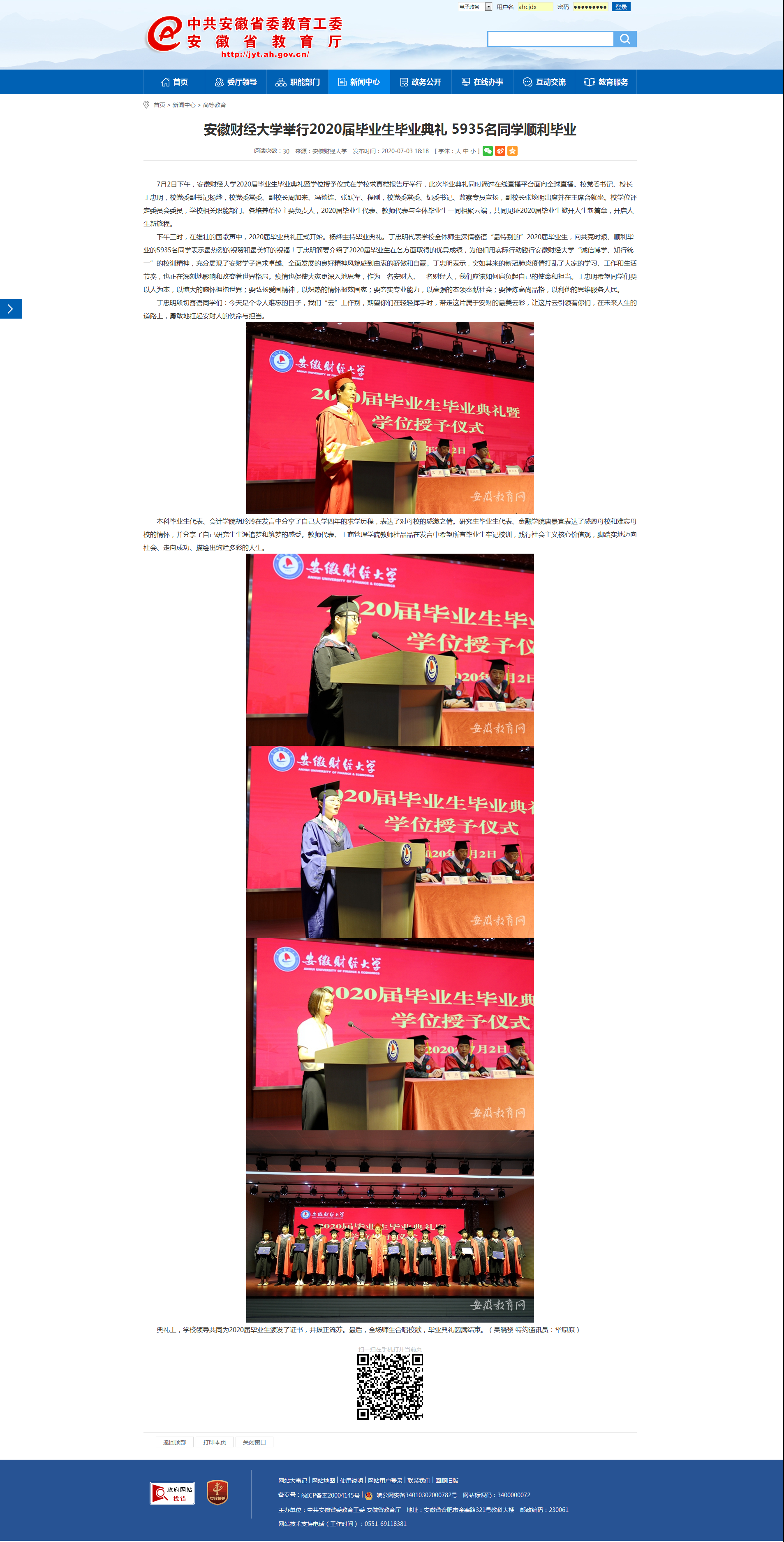 7月3日,安徽教育网、中安教育网、安徽网报道了我校举行2020届毕业生毕业典礼,5935名同学顺利毕业。具体报道链接如下: