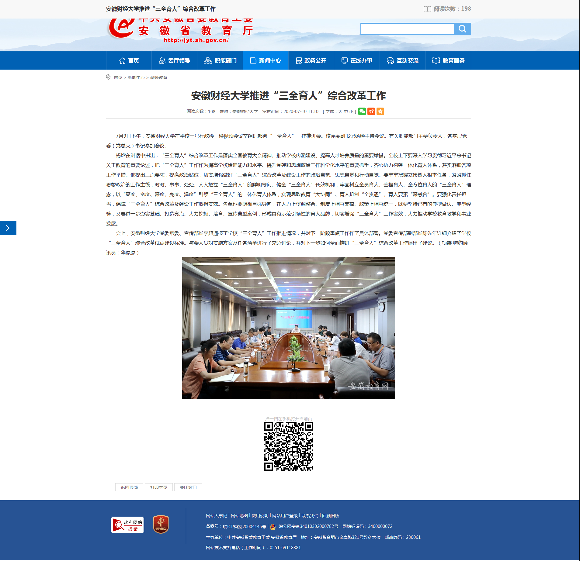 7月10日,安徽教育网、中安教育网报道了我校推进“三全育人”综合改革工作,具体报道链接如下: