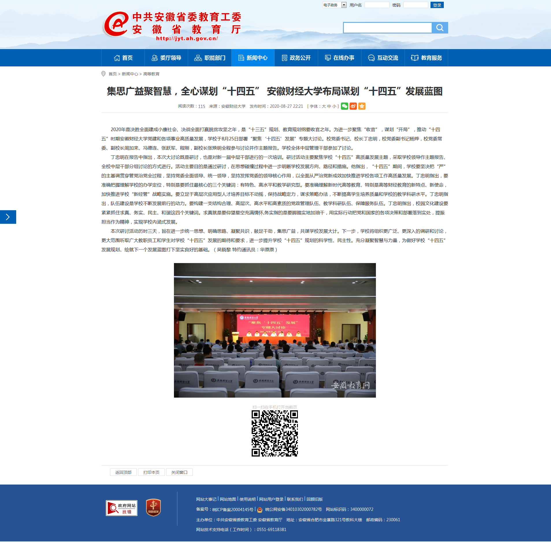 8月27日,安徽教育网报道了我校集思广益聚智慧,全心谋划“十四五” 布局谋划“十四五”发展蓝图。具体报道链接如下: