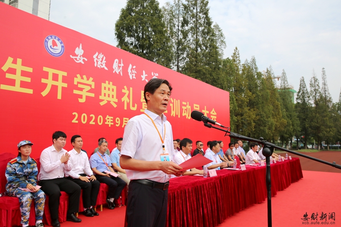丁忠明对全体新同学的到来表示热烈欢迎。他指出,2020年,突如其来的新冠疫情对所有人都是一次大考。在党中央的坚强领导下,全国人民众志成城、共克时艰,取得了统筹推进疫情防控和经济社会发展工作的显著成效,交出了一份高分答卷。作为非常特别的一届新生,同学们自新冠肺炎疫情暴发以来经历了居家学习、线上课堂、延迟考试等一系列新挑战,并凭借着坚持、自律、高效和认真,最终斩获胜利,顺利考入我校。丁忠明希望全体新生要以坚韧不拔的意志面对磨难,不断锤炼品质、完善自我,以“千磨万击还坚劲,任尔东南西北风”的精神直面人生,在可能的挫折和磨难中淬炼真金;要以坚定不移的信念拥抱梦想,注重奉献担当、涵养人格,以“苟利国家生死以,岂因祸福避趋之”的精神,将自己的梦想和国家民族的命运相联系,将实现自身的价值与奉献相结合,让梦想的光芒照耀四方;要以坚持不懈的努力追求真知,秉持“诚信博学、知行统一”的校训精神,永远奋发进取、探索世界,在潜心研究专业知识的基础上,放宽视野,培养明察万物的大智慧。丁忠明希望全体新同学坚守住个人的前途和命运,把握住自己的人生方向,在即将开始的新征程中,将安财当成新的家园,在坚持和坚守中筑梦前行、成长成才。最后,丁忠明祝愿每一位2020级新同学都能在安财未来的学习与生活里收获知识、友谊和成长。