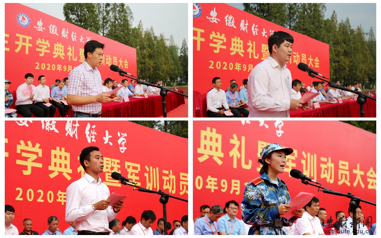 教师代表、经济学院李强在发言中希望同学们秉承校训精神,积极进取,砥砺奋进,不负韶华,勇往直前。财政与公共管理学院王卫、法学院王坤、会计学院任方露先后代表在校生、研究生新生和本科生新生在典礼上发言。