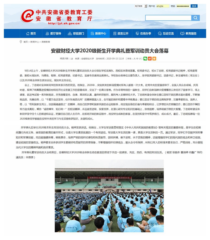 9月15日,安徽教育网报道了我校举2020级新生开学典礼暨军训动员大会,具体报道链接如下: