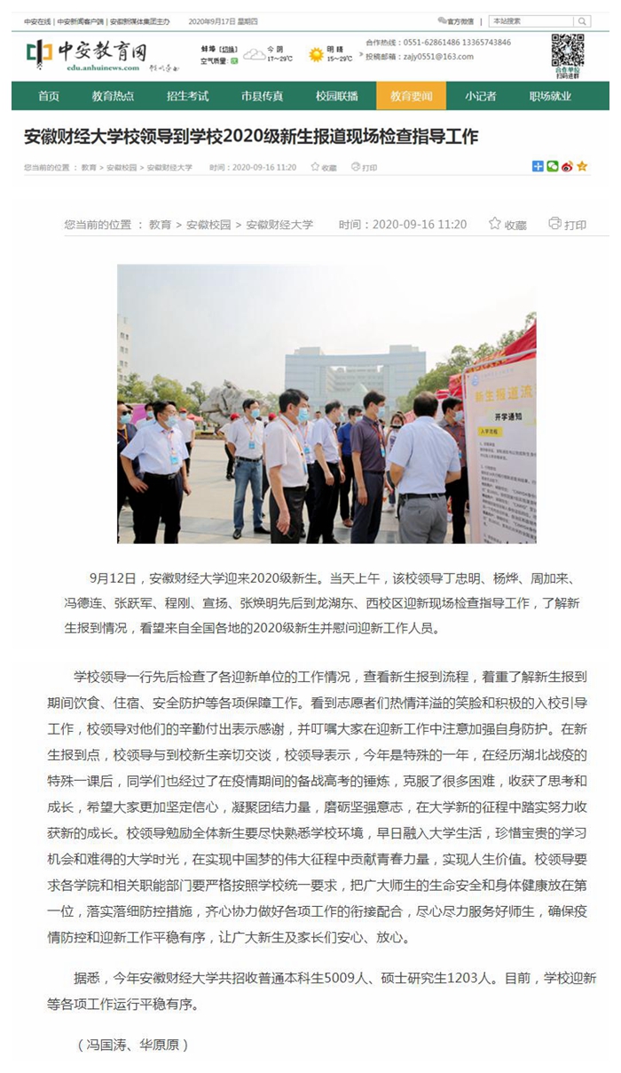 9月16日,中安教育网报道了我校到2020级新生报道现场检查指导工作,具体报道链接如下: