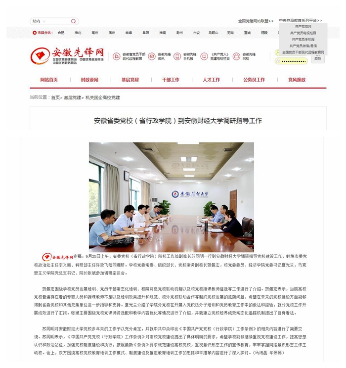 9月28日,安徽先锋网报道了安徽省委党校(省行政学院)到我校调研指导工作,具体报道链接如下: