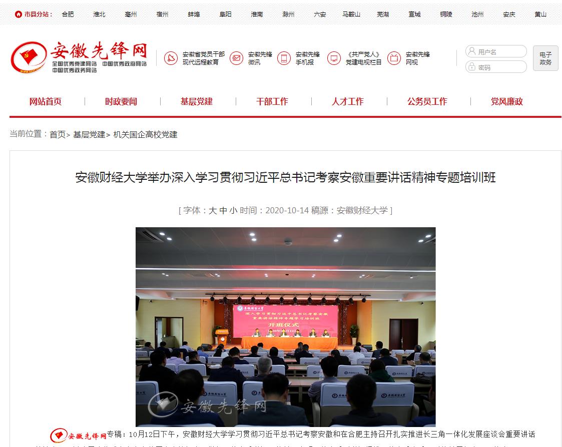 10月14日,安徽先锋网报道了我校举办深入学习贯彻习近平总书记考察安徽重要讲话精神专题培训班。具体报道链接如下: