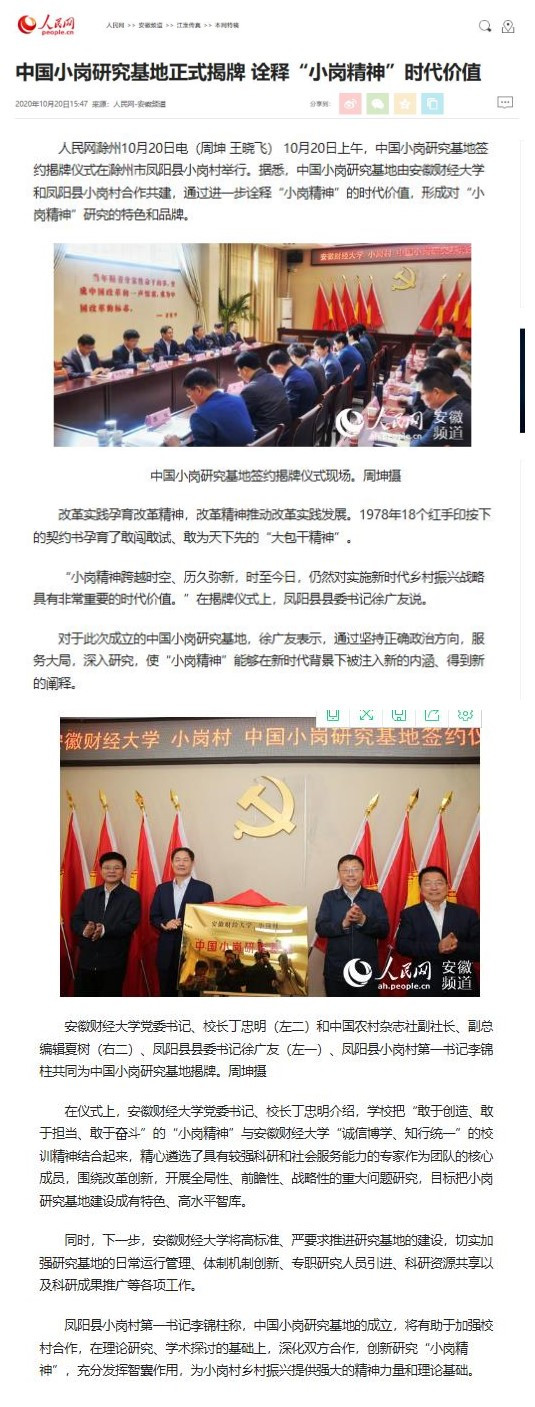 10月20日,人民网报道了我校中国小岗研究基地正式揭牌 诠释“小岗精神”时代价值。