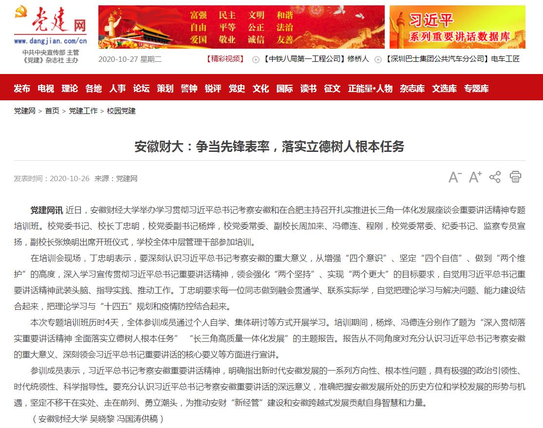 10月26日,党建网以《安徽财大:争当先锋表率,落实立德树人根本任务》报道我校举办学习贯彻习近平总书记考察安徽和在合肥主持召开扎实推进长三角一体化发展座谈会重要讲话精神专题培训班。相关报道具体链接如下:http://www.dangjian.cn/shouye/dangjiangongzuo/xiaoyuandangjian/202010/t20201026_5827997.shtml