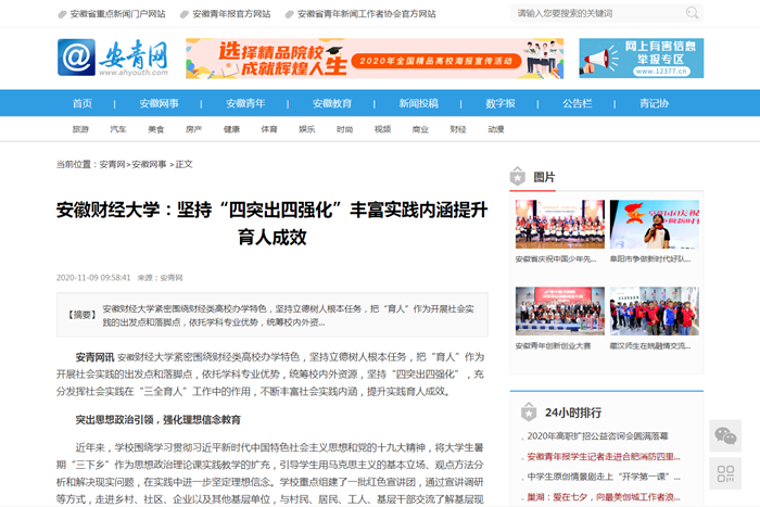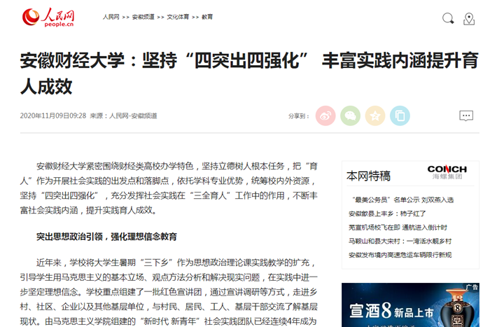 11月9日,人民网、安青网、安青网人民号、安青网澎湃号人民网以《安徽财经大学:坚持“四突出四强化” 丰富实践内涵提升育人成效》为题,报道了我校深入推进实践育人成效。