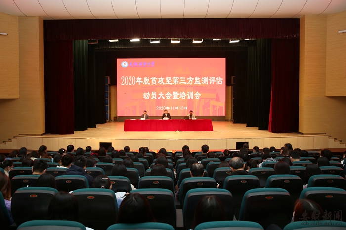 11月13日上午,我校在龙湖东校区艺术楼报告厅召开2020年脱贫攻坚第三方监测评估动员暨培训会。校党委常委、副校长冯德连出席会议并作动员讲话。省扶贫办考核评估处专家程衍生,学校相关职能部门负责人和400余名参加第三方监测评估的教师、研究生参加会议。安徽经济社会发展研究院院长徐旭初主持培训会。