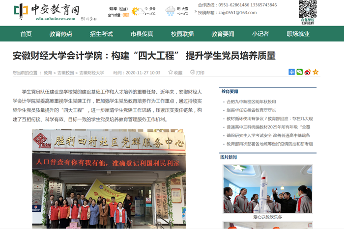 11月26日,凤凰网、安徽新闻网、中安教育网报道我校会计学院构建“四大工程” 提升学生党员培养质量