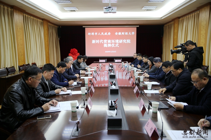 12月8日上午,由蚌埠市人民政府和安徽财经大学合作共建的新时代营商环境研究院签约揭牌仪式在蚌埠市政府第一会议室举行。 蚌埠市委常委,常务副市长郑东涛,安徽财经大学党委常委、副校长冯德连共同为新时代营商环境研究院揭牌,蚌埠市政府副秘书长李晓和我校安徽经济社会发展研究院院长徐旭初签署合作协议。厦门大学中国营商环境研究中心执行主任许志端,蚌埠市政府和安徽财经大学相关部门负责人出席仪式。徐旭初主持签约揭牌仪式。