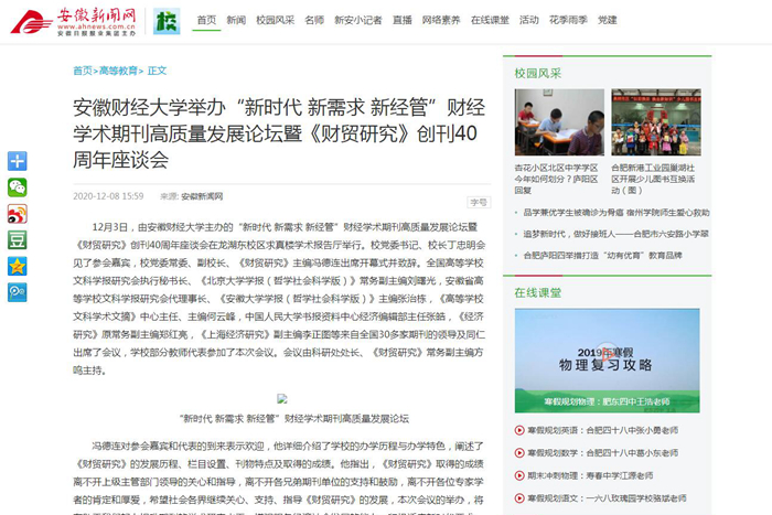 12月8日,凤凰网、安徽新闻网报道我校举办“新时代 新需求 新经管”财经学术期刊高质量发展论坛暨《财贸研究》创刊40周年座谈会。