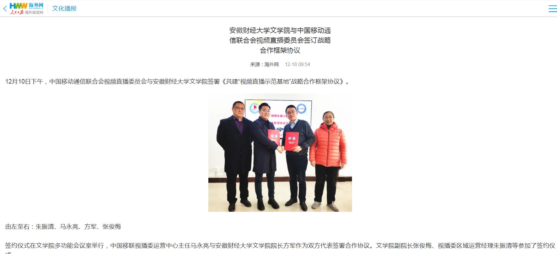 12月18日,人民日报•海外版以《我校文学院与中国移动通信联合会视频直播委员会签订战略合作框架协议》为题,报道了我校与中国移动通信联合会视频直播委员会签署《共建“视频直播示范基地”战略合作框架协议》。