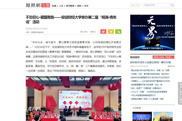 12月21日,凤凰、安徽新闻网报道我校举办第二届“明湖•青年说”活动