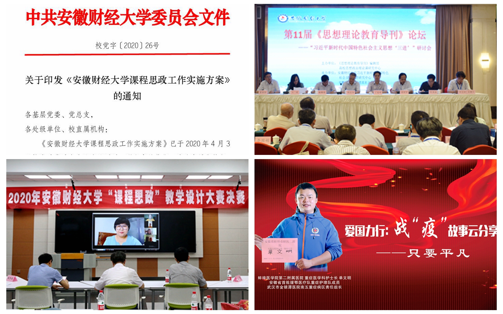 学校党委制定《关于加强和改进新形势下思想政治工作的实施意见》《深入学习贯彻落实全国全省高校思想政治工作会议精神实施方案》等文件,成立由党委主要负责人担任组长的思想政治工作领导小组、意识形态工作领导小组、思想政治理论课建设领导小组、课程思政工作领导小组等,全面开展思想政治工作;定期组织召开思想政治工作领导小组会议、意识形态领导小组专题会议和“三全育人”工作推进会。建立校领导联系师生和听课制度,校领导班子成员走进课堂为师生讲授形势政策课,走进学院和班级,及时倾听和了解师生思想状况,特别关注育人工作中存在的短板和弱项,解决育人工作中存在的不足。初步形成了党委统一领导、党政齐抓共管、部门各司其职、全校师生共同参与的大思政工作格局。2018年,学校成为安徽省首批“三全育人”综合改革试点建设高校,统数学院成为安徽省“三全育人”综合改革试点院系;2019年4月,学校入选安徽省第一批高校网络思想政治工作中心试点高校;2020年,会计学院思想政治工作创新案例入选安徽省首届思想政治工作创新案例推广名单。