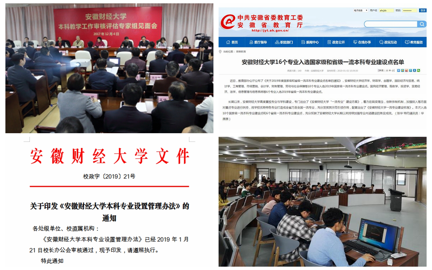 “十三五”期间,学校着力加强专业建设,持续优化专业结构,出台《安徽财经大学本科专业设置管理办法》,推动就业、招生计划与人才培养形成有效联动,建立健全了专业有进有出的动态调整机制,形成了经管法为主、文理工艺等多学科专业协调发展的结构与布局。2016年以来,学校新增“互联网金融”“数据科学与大数据技术”“数字经济”“人工智能”等6个体现学校优势与特色、满足地方及行业战略新兴产业的交叉复合专业。出台《安徽财经大学“一流专业”建设方案》《安徽财经大学“一流专业”建设标准》,着力在转变理念、创新体制机制、加强投入等方面对学校优势特色专业进行重点打造。“十三五”期间,学校新增国家级一流本科专业建设点10个,省级一流本科专业建设点6个,省级特色(品牌)专业11个,省级专业综合改革试点4个。