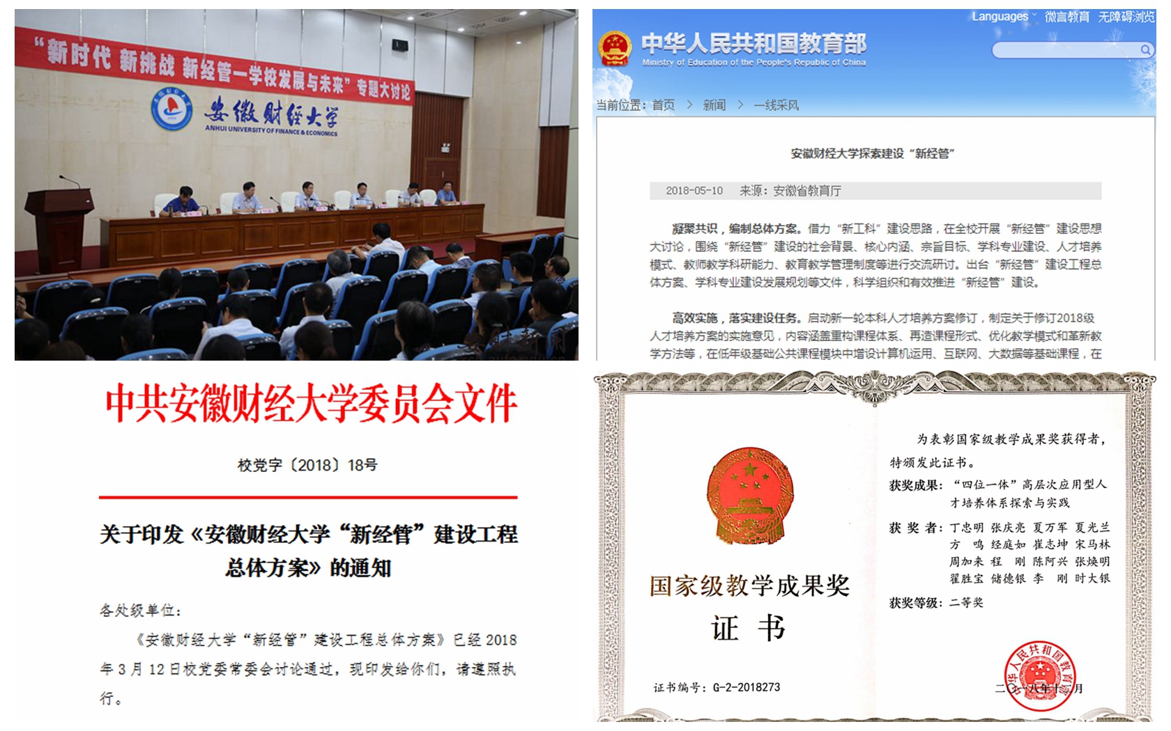 学校以2017年本科教学工作审核评估为契机,在教育部力推“新工科”建设发展过程中,紧跟高等教育改革发展步伐,顺应形势、调整思路,2018年1月,在全国率先提出“新经管”发展战略。随后着力围绕“新”字做文章,先后出台《“新经管”建设工程本科人才培养方案修订等工作方案》《安徽财经大学关于全面振兴本科教育实施方案》等30余项方案、措施、制度,全力重构和打造新的教学理念、教学内容、教学手段、教学方式、教学服务、教学管理和保障体系,从人才培养方案修订、专业和课程建设、学科竞赛和实践教学、师资队伍建设等方面纵深推进系列教育教学改革,落细落小落实“新经管”发展战略,并取得了一系列成效。2018年,学校《四位一体”高层次应用型人才培养体系探索与实践》获国家级教学成果二等奖。“十三五”期间,学校共获省级各类教学成果奖64项,其中特等奖7项,一等奖17项,二等奖19项,3等奖21项。
