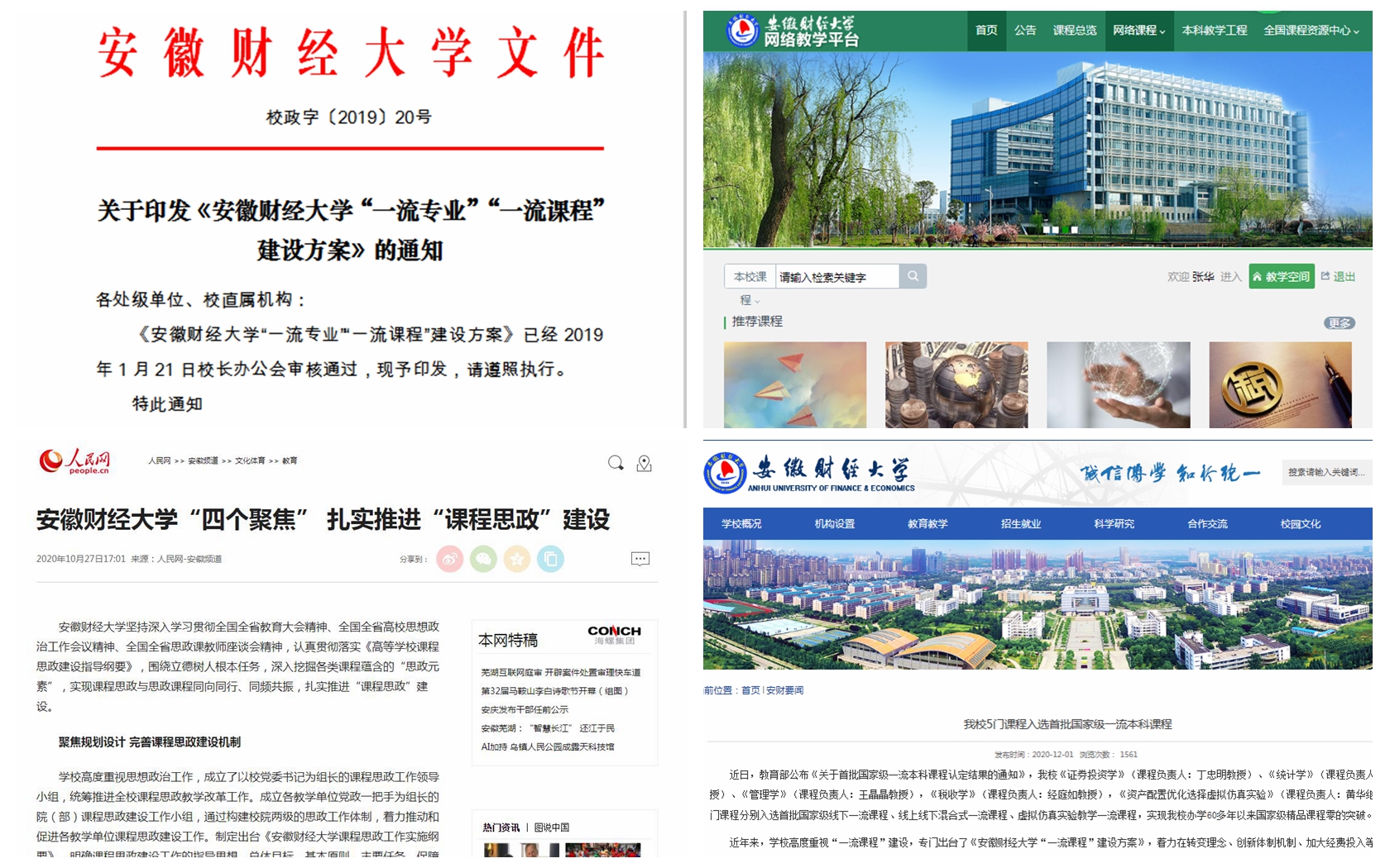 为提升新时代人才培养质量,完善学校的课程体系建设,学校通过重构思想政治理论与实践、通识教育、学科基础、专业理论与实践、创新创业实训、分类教育等六大教育平台,将“第二课堂”纳入人才培养方案毕业审核学分,将体育、美育、劳动教育纳入人才培养方案,出台《安徽财经大学“一流课程”建设方案》《安徽财经大学“一流课程”建设标准》等,大力建设线上、线下、线上线下混合、虚拟仿真、社会实践等五大“金课”,发挥学校经济管理学科综合优势,大力加强专业基础课程、大类平台课程和跨学科课程建设。“十三五”期间,建有五类国家级、省级一流本科课程122门,其中国家级线下一流课程3门、线上线下混合式一流课程1门、虚拟仿真实验教学一流课程1门,省级大规模在线开放课程(MOOC)58门、线下一流课程29门、线上线下混合式和社会实践课程23门、虚拟仿真实验教学一流课程7门。引进优质在线课程300余门,通过网络教学平台自建课程3545门,同比“十二五”时期增长明显。