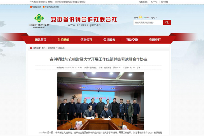 1月1日,安徽省供销合作社联合社官网报道吴良斯一行来我校调研并签署战略合作协议