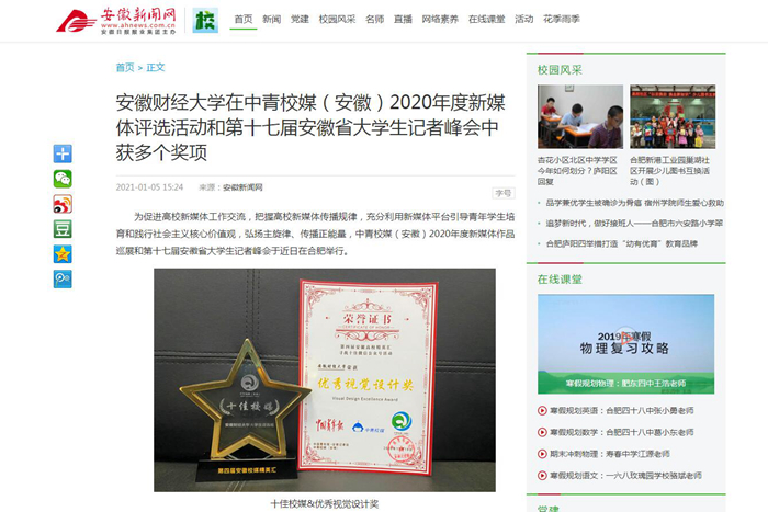 1月5日,凤凰网、安徽新闻网报道我校我校在中青校媒(安徽)2020年度新媒体评选活动和第十七届安徽省大学生记者峰会中获多个奖项。