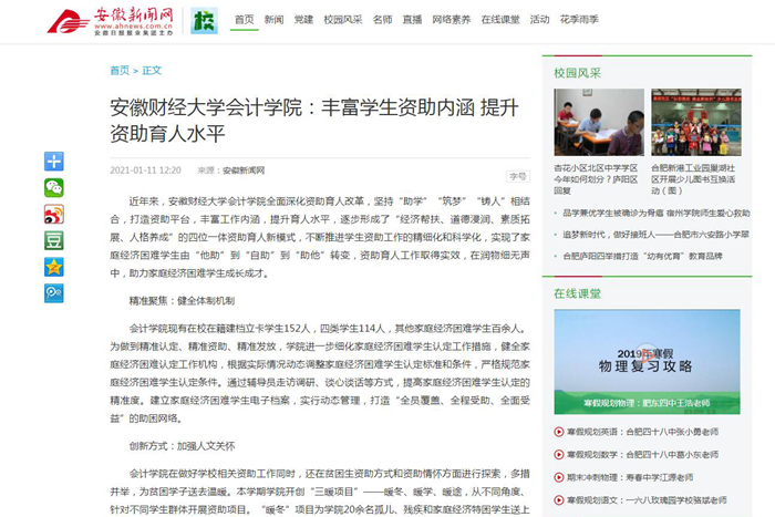 1月11日,凤凰网、安徽新闻网报道我校会计学院丰富学生资助内涵提升资助育人水平。