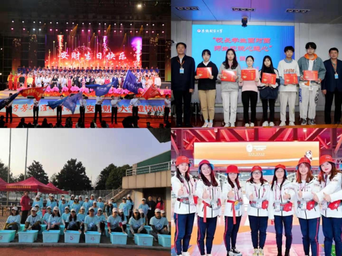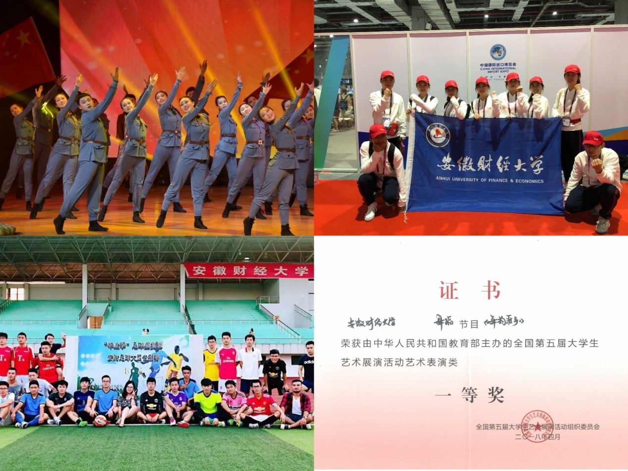 搭建以社会实践为主体的德育平台。制定《安徽财经大学学生社会实践活动管理办法(试行)》,实施社会实践学分制,实现社会实践和理论课堂的对接。“十三五”期间,学校累计组建5593支社会实践团队,全校约8万人次参加了寒暑期社会实践,累计获得省级以上相关表彰94项。人民网、中国新闻网、中国青年网等省级以上新闻媒体对活动报道稿件2689篇。建设以创新创业为重点的智育平台。“十三五”期间,学校大学生创新创业训练计划项目累计立项国家级项目2215项,立项数量连续五年位列全省第一,全国地方高校前列;学校大学生创业孵化基地成功备案省级众创空间,累计孵化项目113项,培养创业学生1126人;学校在“挑战杯”“创青春”赛事中获奖58项。构建以养成教育为依托的体育平台。深入推进“三走”系列活动,分层分类开展“健康安财”早锻炼活动。依托12个体育类社团开展了以“新生杯”篮球赛、校足球赛等为主体的体育活动,积极组织动员学生参与各类体育赛事,不断营造浓厚校园体育氛围。2018年,学校足球协会被评为全国百佳校园足球协会,武术协会被评为全国学生最具影响力体育社团。构建以文化传承为核心的美育平台。通过持续推进“一院一品”,统筹规划安徽淮河流域特色文化项目建设,开展高雅艺术进校园、徽风皖韵进高校、“淮河之春”非遗进校园、花鼓灯文化周等活动,营造弘扬和传承中华优秀传统文化的浓厚氛围。在全国第五届大学生艺术展演中,原创的花鼓灯舞蹈《舞韵淮乡》获得国赛一等奖和优秀创作奖,学校获得高等学校优秀组织奖。搭建以志愿服务为抓手的劳育平台。制定《安徽财经大学学生志愿服务管理暂行办法》,以校院两级青年志愿者协会为依托,常态化开展以支教、敬老、爱心校园等为主题的校内外志愿服务项目。高质量完成上海进口博览会、省运动会等大型赛会的志愿服务工作。疫情防控期间,全校共有570余名青年志愿者投身疫情防控一线。“十三五”期间,学校有2人获评“安徽省青年志愿者优秀个人”,“筑梦童年”项目荣获2018年安徽省志愿服务项目创新大赛二等奖,学校青年志愿者协会获2019年“安徽省青年志愿者优秀组织奖”。